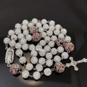 Hip Hop 10mm Rhinestone Cluster Rosary Necklace Disco Ball Beaded Pendant Catholic Our Lady of Guadalupe Prayer Rosary