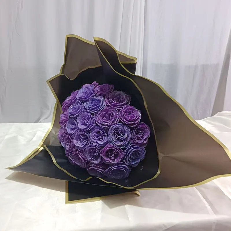 Coice 3:30pcs of glitter rose head+30pc of 30cm metal stem+3sheet of 55x55cm black gold packaging paper with 2M Love is eternal ribbon